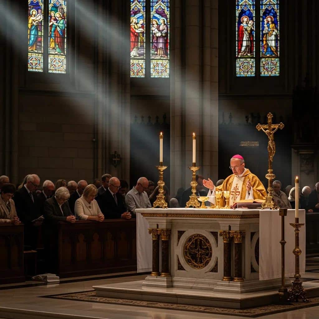 2. Eucharist: The central act of Catholic worship, representing the body and blood of Christ.